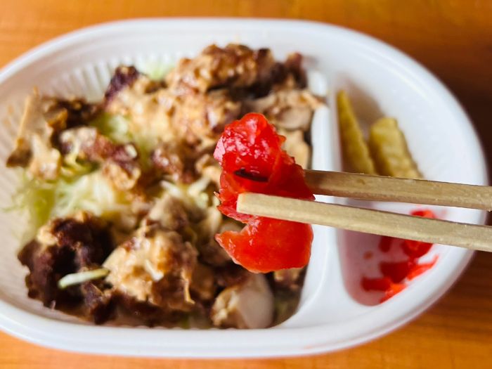 そして福神漬け。お弁当によって漬物が変わるんですね。細かいところまでこだわられているのが分かります。