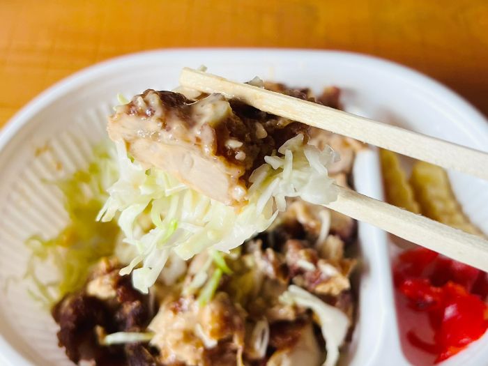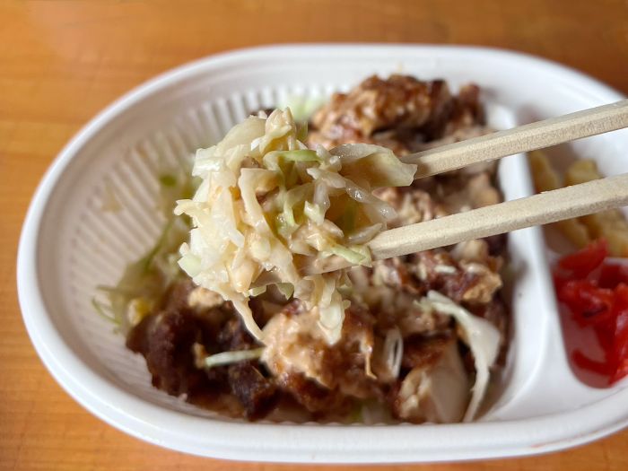 チキンの下にはたっぷりのキャベツ。チキンサラダ弁当の所以が分かりますね。