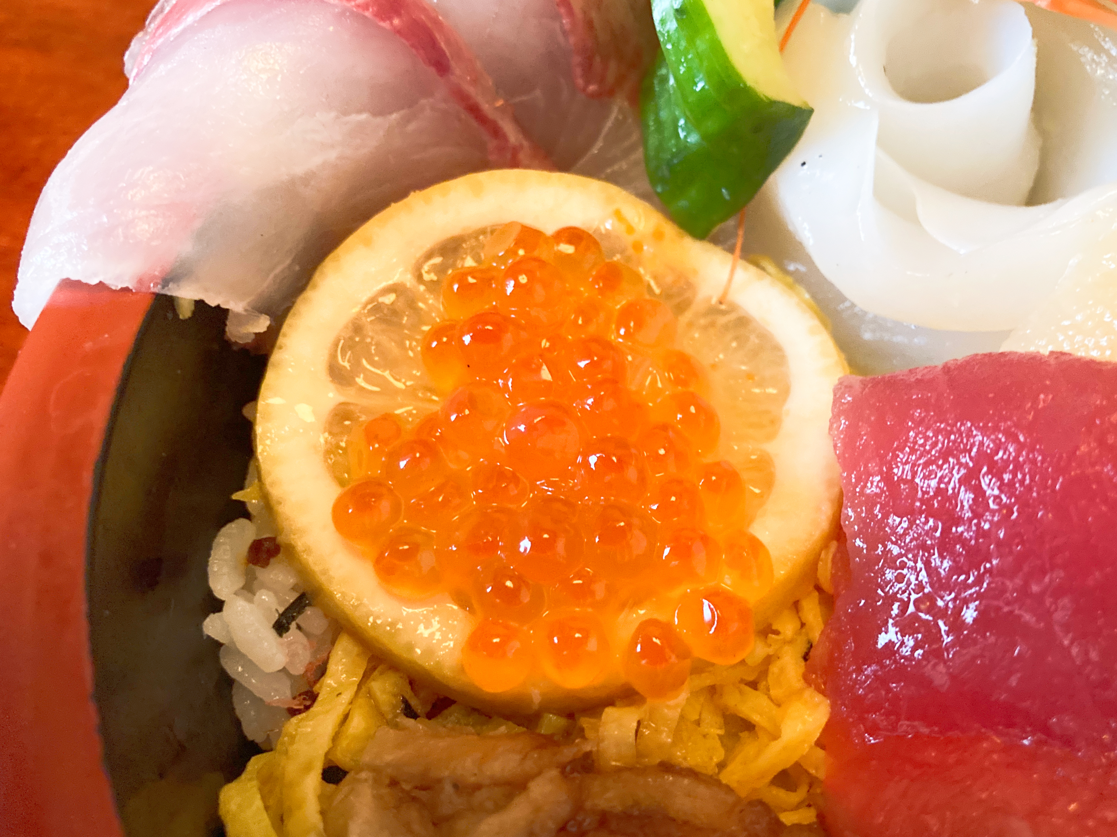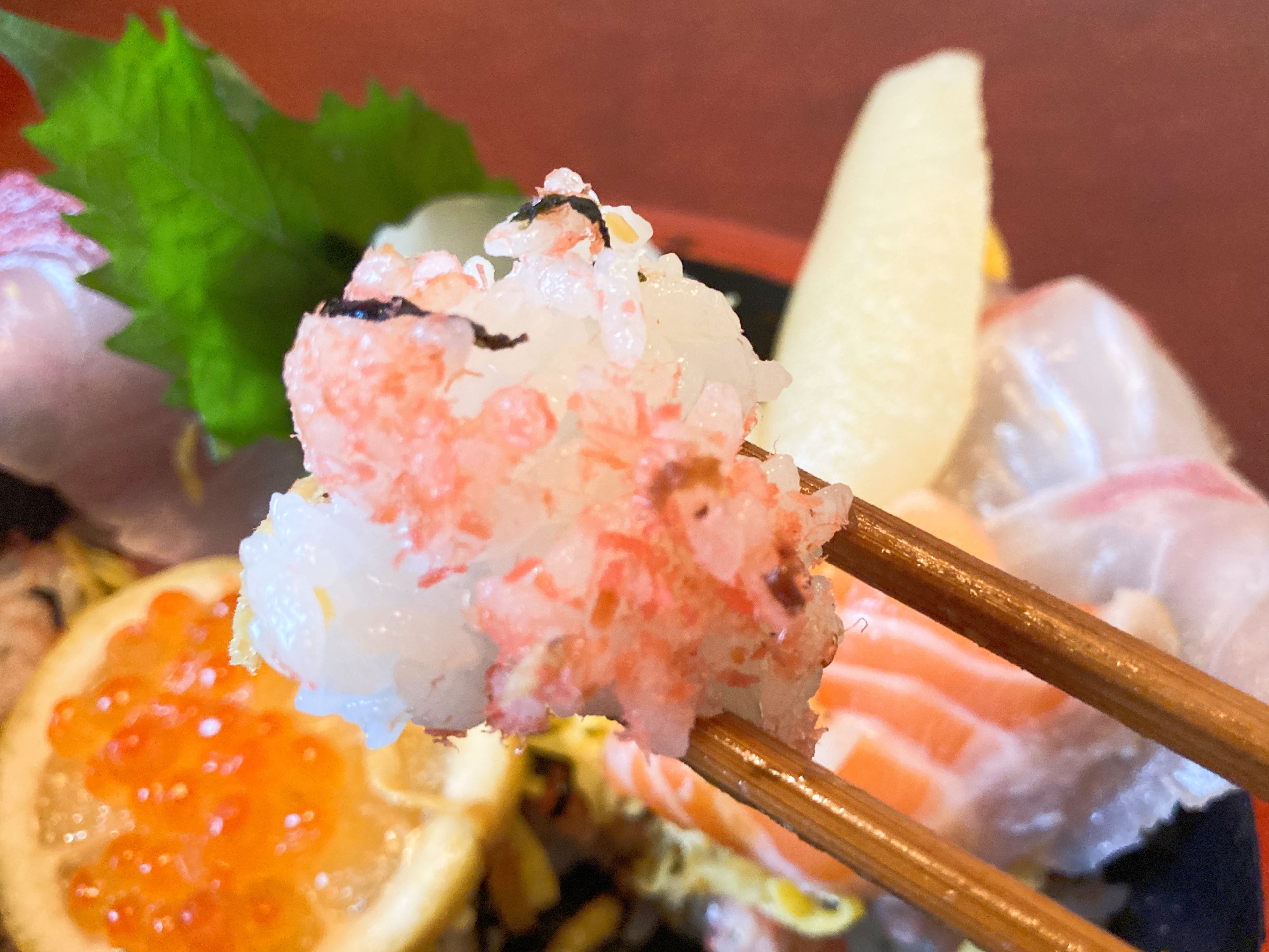 海鮮の下にある酢飯は桜でんぶがたっぷり乗っているパターン。そして、甘い味付けの薄焼き玉子と食べると優しい味に。ふんわりと甘くて、これだけでも幸せな気持ちになります。
