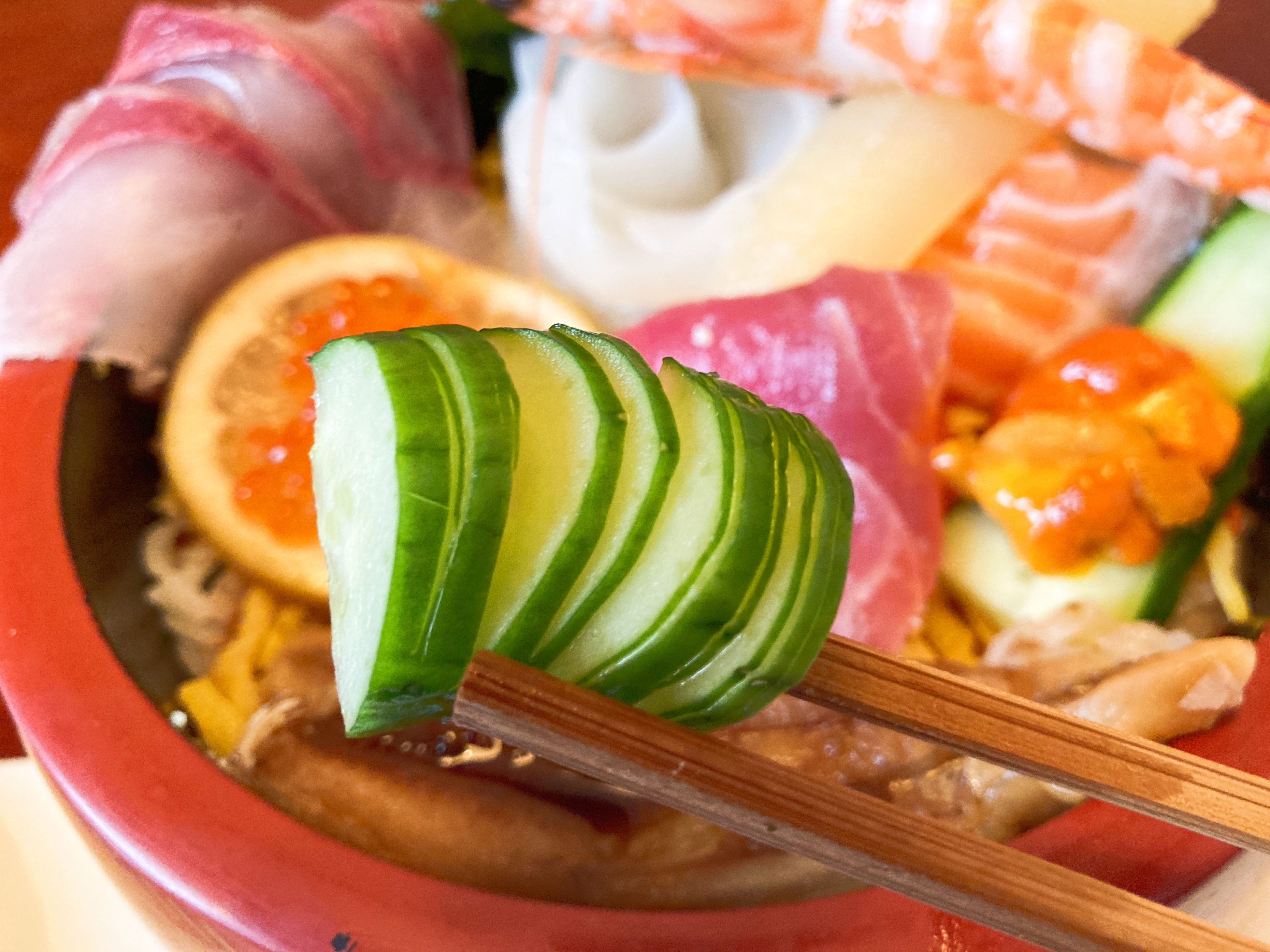 しかし、安いからと言って全く手抜きはありません。ちらし寿司の随所に職人の技が散りばめられています。きゅうりもこんなに芸術的。