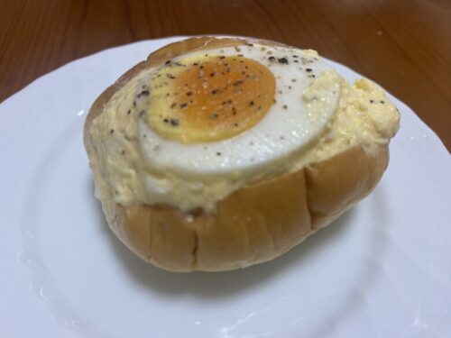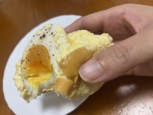 上にも半分にカットされたゆで卵が載っていますが、中のフィリングも刻んだ卵がぎっっしり入っています。