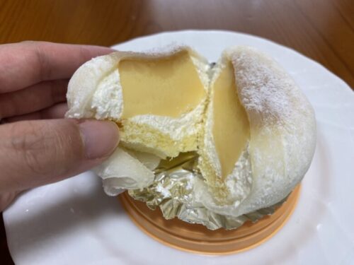 柔らかい求肥の中に同店の「嘉島ぷりん」より少し固めに作られたプリン、生クリーム、スポンジケーキが入っています。