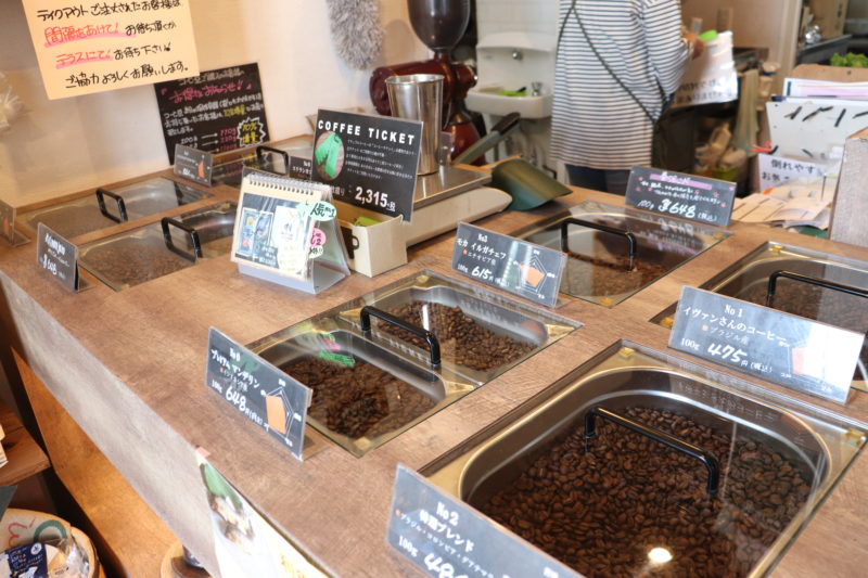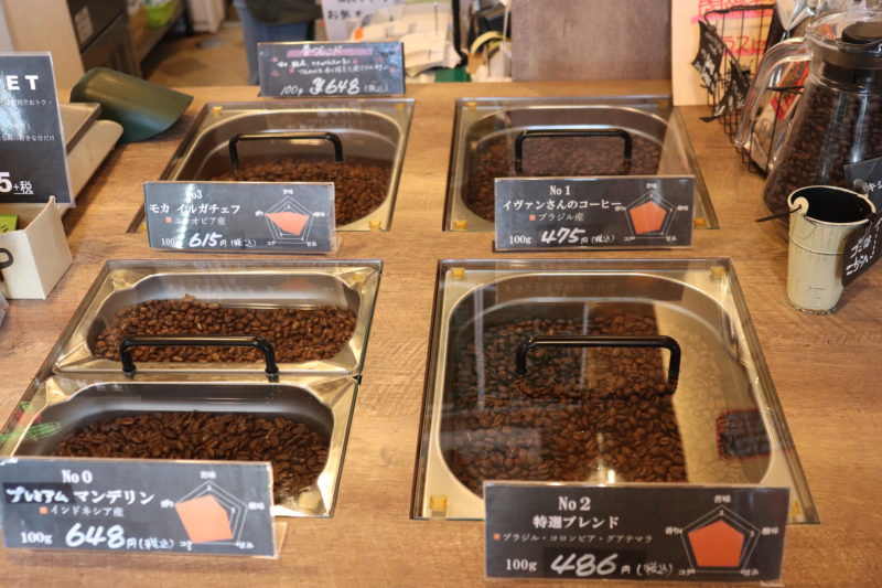 店内へ入ると、まず目に飛び込んでくるのがずらりと並ぶたくさんのコーヒー豆。