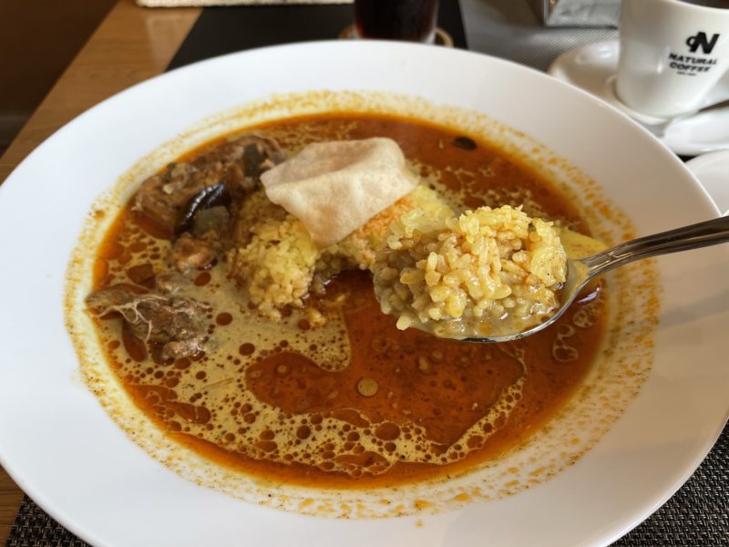 スパイス独特の味が濃く、ご飯がパラパラしているためスープカレーとの相性は抜群。