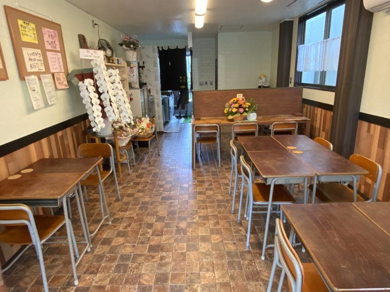 店内は学校を連想させる机イスが並んでいます。