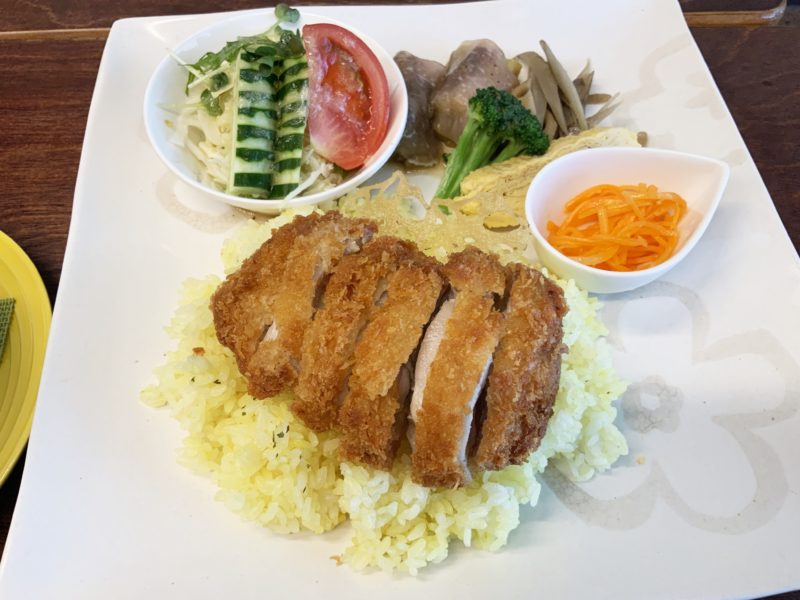 ライスはターメリックライスで、今回はプレートなので周りにお惣菜とサラダも。