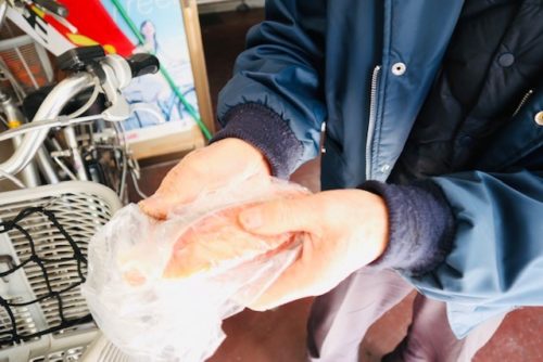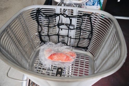 預かっている自転車のかごにIN。はよ冷蔵庫に入れなっせ!!笑