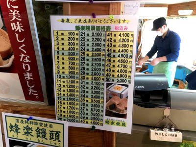 蜂楽饅頭の価格表があったので見たのですが、1個100円。50個5000円!