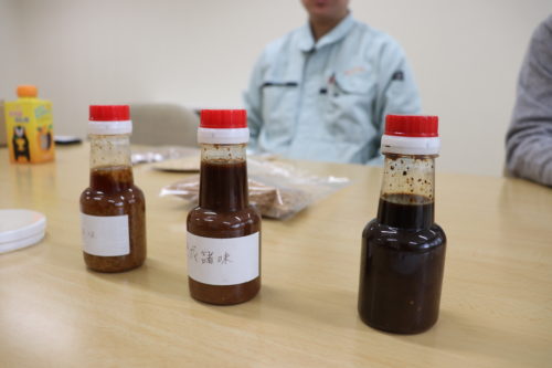 色も変わってくるでしょ?右側の一番濃い色のお醤油が「生揚げ(きあげ)醤油」。まだ味の調整とかしてないやつね。