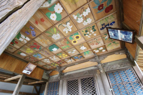 薬師堂内部には、見事な天井画も。中央奥には薬師如来像が安置され、十二神将らしき像もおさめられていました。