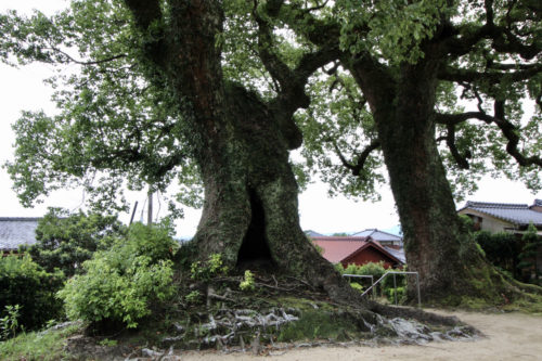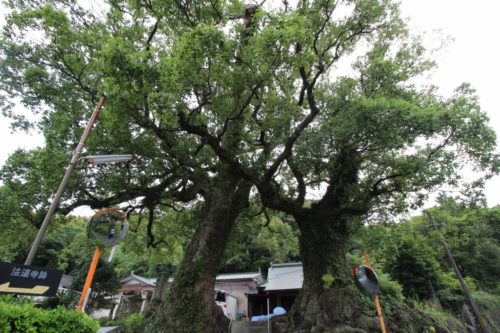 薬師堂の前に立つ2本のクスノキ。法道寺そのものはすでに廃寺になっていますが、この薬師堂のほか、少し離れた場所に石碑や観音堂も残されています。