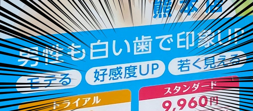 「いや、私ね歯が白くなるってあこがれてはいたけれども、こんなおっさんがきれいになったところでどうなんだよって思ってたクチでして。でもやってみて思った!これは清潔感が簡単に手に入るから中年こそしたほうがいい!と!」