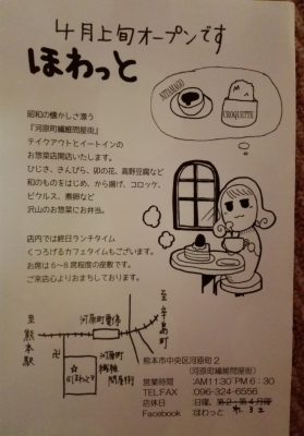 熊本市中央区河原町(通称、河原町繊維問屋街)に4月にオープンした、惣菜屋さん「ほわっと」に行ってきました。
