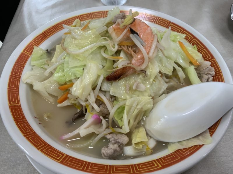 続いて、「長崎ちゃんぽん(税込600円)」。普通の「ちゃんぽん(税込500円)」との違いは、具材でこっちはエビなどの海鮮系の具材が加わっているそうです。野菜の下にも何尾かいました。