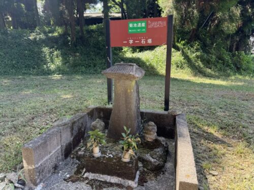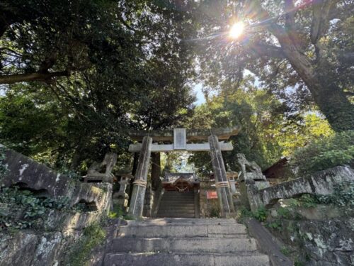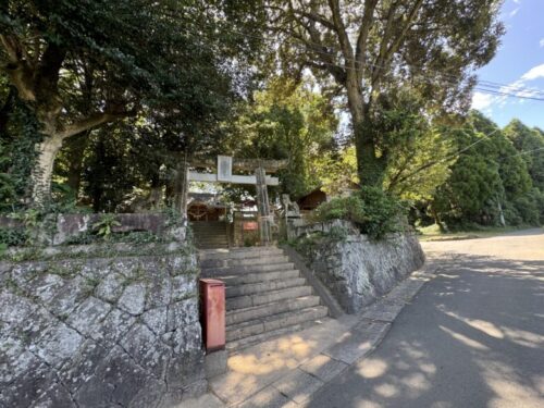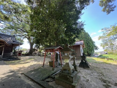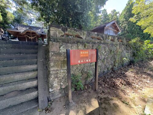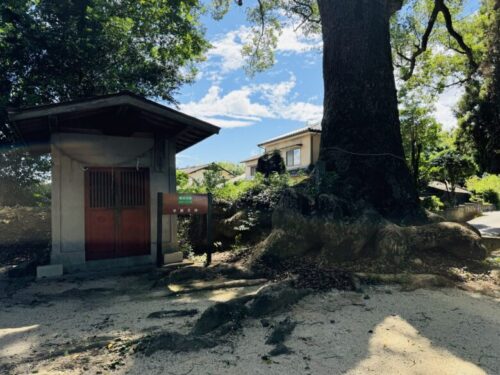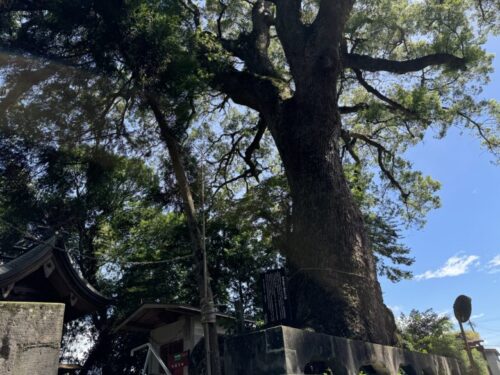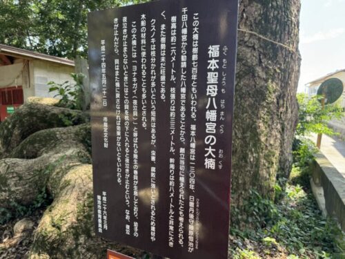 菊池市泗水町福本にあまりにも大きな木を発見。そこに引き寄せられていくと、福本八幡宮という神社があり、敷地内に三つの菊池遺産がありました。