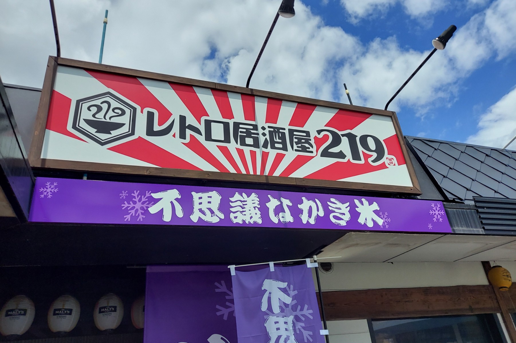 目的の店に到着してみると、看板には「レトロ居酒屋219」の文字が。