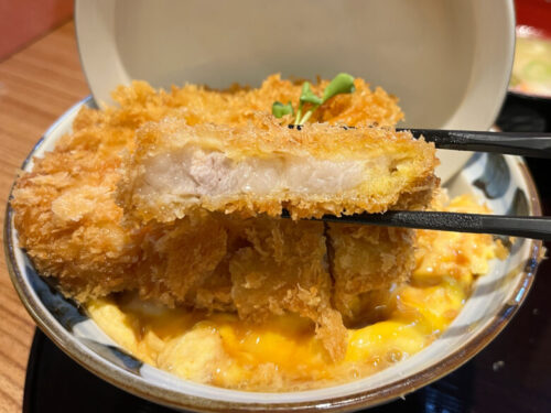 どんぶりからはみ出るくらい大きいとんかつ。そしてご覧ください、この厚み!
