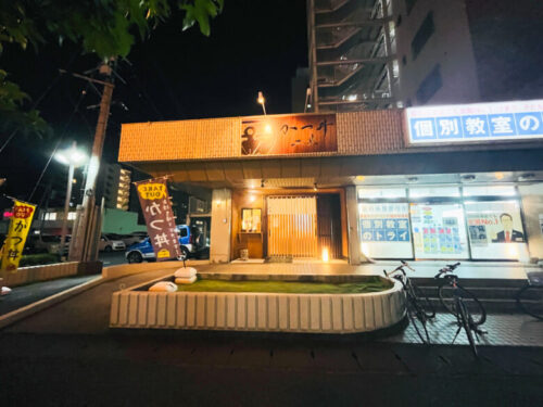 夜にこんにちは、今回は「かつ丼 二葉」をご紹介します。場所は、上熊本1丁目にある集合住宅コープ野村の1階。コンビニや焼肉屋さんのすぐ近くです。