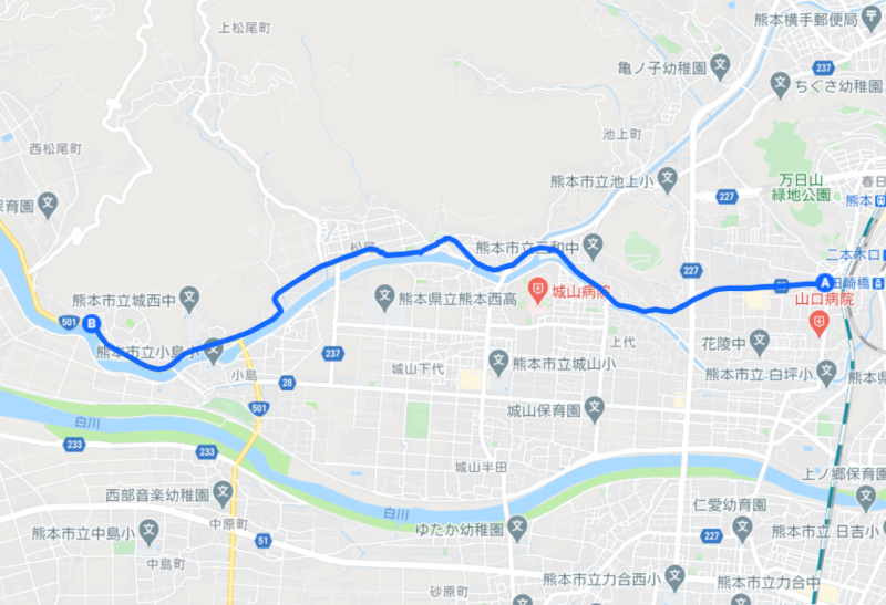 ここから、まっすぐ上代方面に進み、坪井川沿いに高橋を経由し、百貫港に向かいます。