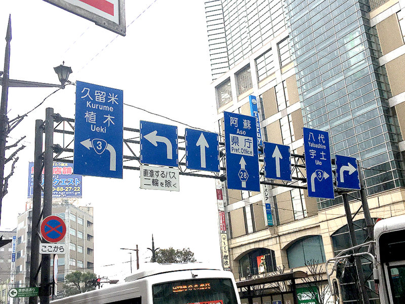 そこから少し先に各交通手段が絡み合う水道町交差点があり、手前にある道路標識看板が冷静に眺めてみたら“何だかわかりにくい”と総務省の機関「総務省熊本行政評価事務所」が熊本市に改善を求めているとのニュースがありました。