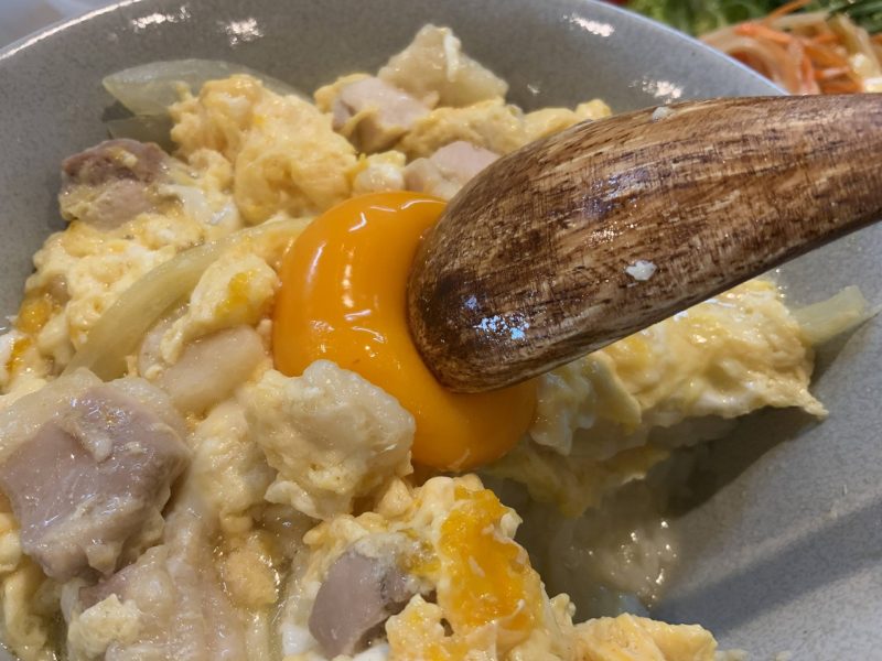 まずは親子丼。ふわっふわにとじられた卵の上に、卵の黄身がボフッと乗っています。