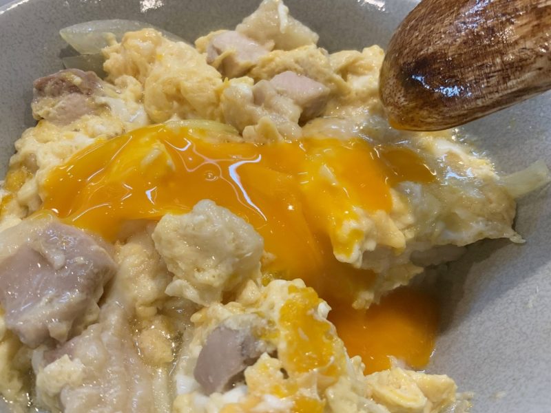 次に、親子丼のときと同じ要領で卵プチュンして一緒に。