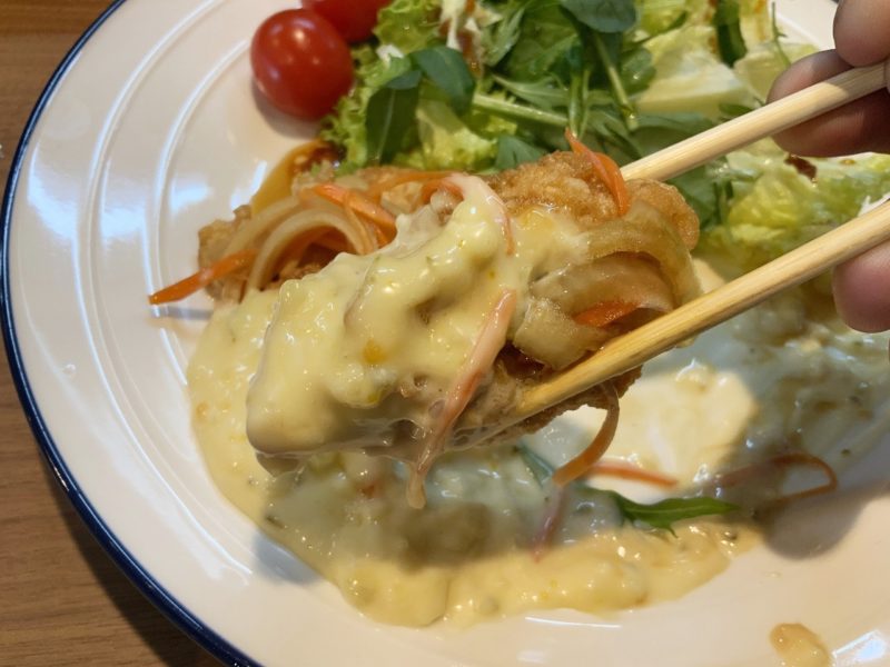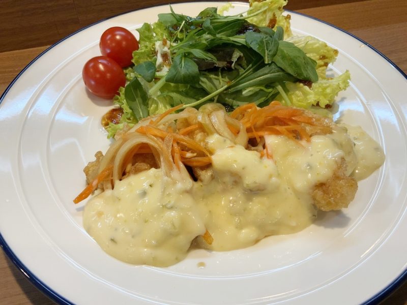 続いて、チキン南蛮。甘酢の染み込んだ玉ねぎとにんじんに、自家製のタルタルソースがたっぷりかかっています。