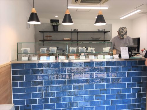 店内は、さわやかなブルーのタイル張りのカウンターの上に、ガラスのショーケースがあり、おにぎりが並ぶ、スタイリッシュな雰囲気です。