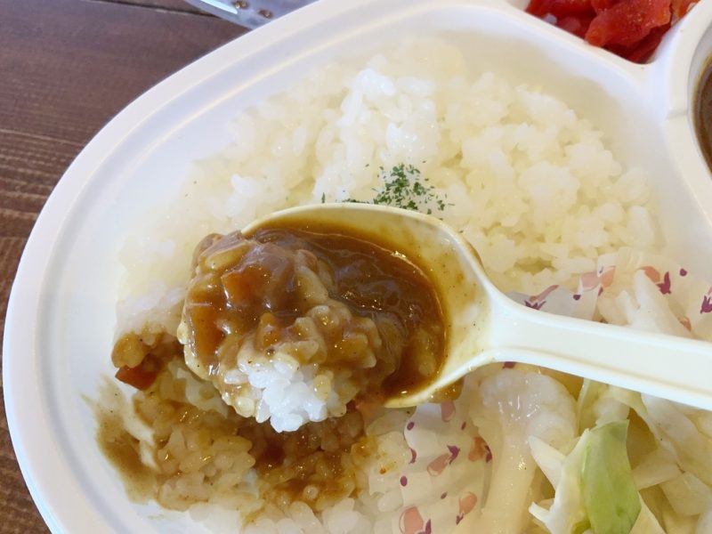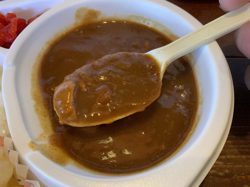口に含んだ瞬間は普通のカレーに感じましたが、すぐに豚骨の風味がやってきて、飲み込んだ後に口の中にスパイスの辛味が広がります。