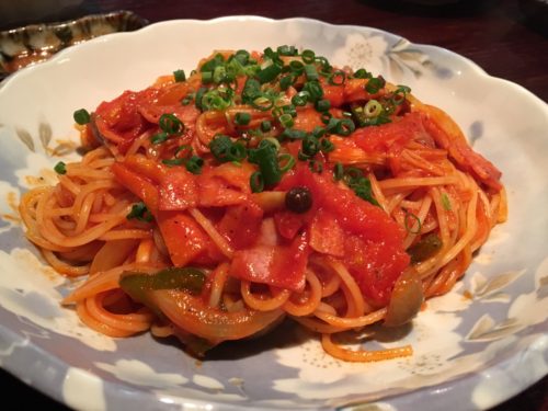 そしてこちらは、昔ながらのナポリタン。トマトが濃厚な甘めのソースと、細めのパスタがよく絡み合っていて絶品!具だくさんで食べ応えもあり、ほっとする一品です。