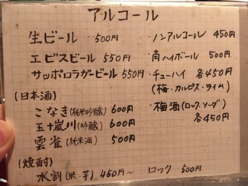 手書きのアルコールメニューも味があり、どこか懐かしさを感じます。