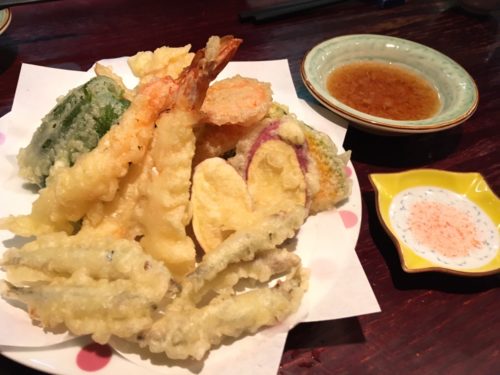 大きな海老が3尾に、きびなごの天ぷら!野菜は、さつまいも、かぼちゃ、ピーマン、人参、そして、写真からは見えない部分にナスとごぼうまであって、お値段以上のボリューム!