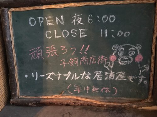 正面からは見えない扉の奥に、手書きのくまモンが描かれたお店の案内があります。