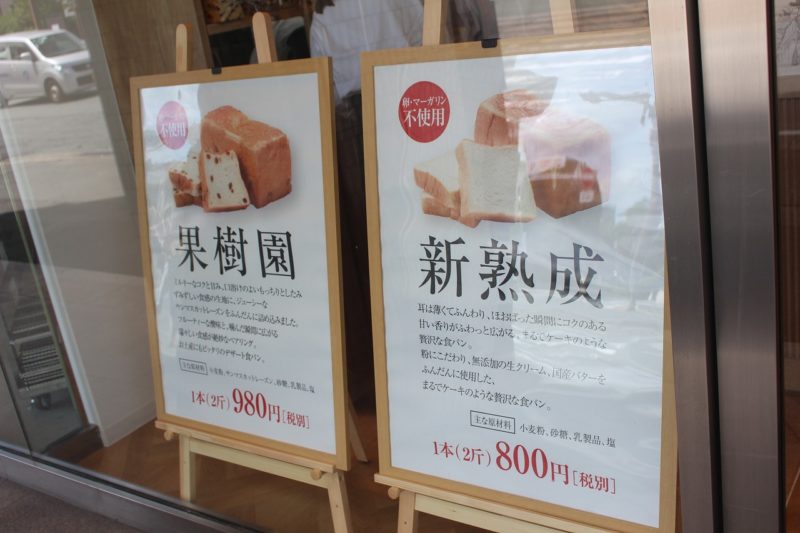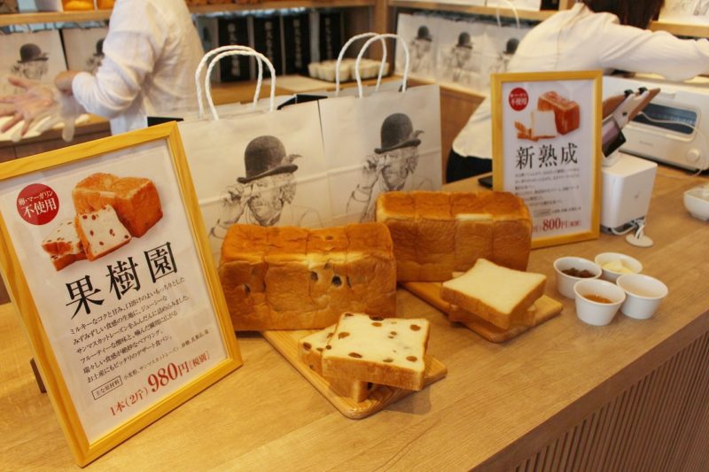 偉大なる発明で販売される高級食パンはこだわりの小麦粉と無添加の生クリームを使用した「新熟成(税別800円)」とジューシーなサンマスカットレーズンを使用した「果樹園(税別980円)」の2種類。