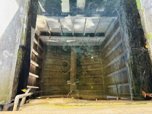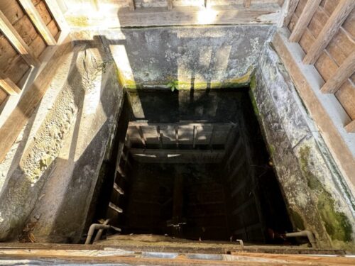覗いてみるととても透明な水がありました。湧いているような感じはせず、とても静かに、そっと水が天井をうつしておりました。