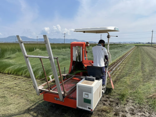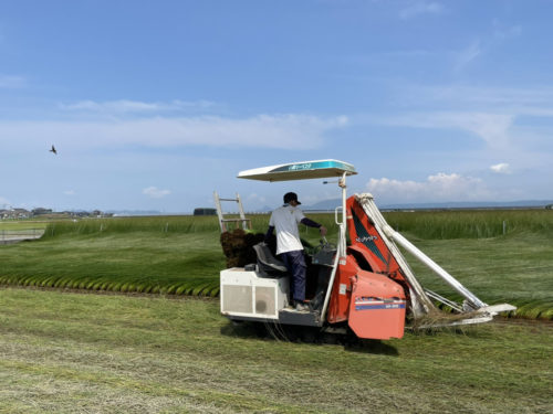 イグサックさん、この日は早朝5時半からイグサの収穫作業中でした。早い。