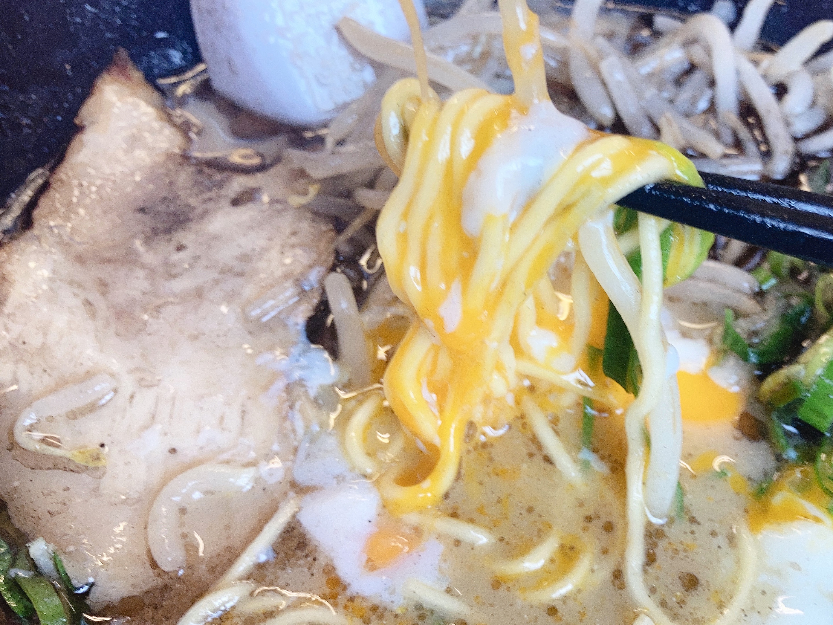 とろーりとした黄身に麺とスープをたっぷり絡めて頂きます。