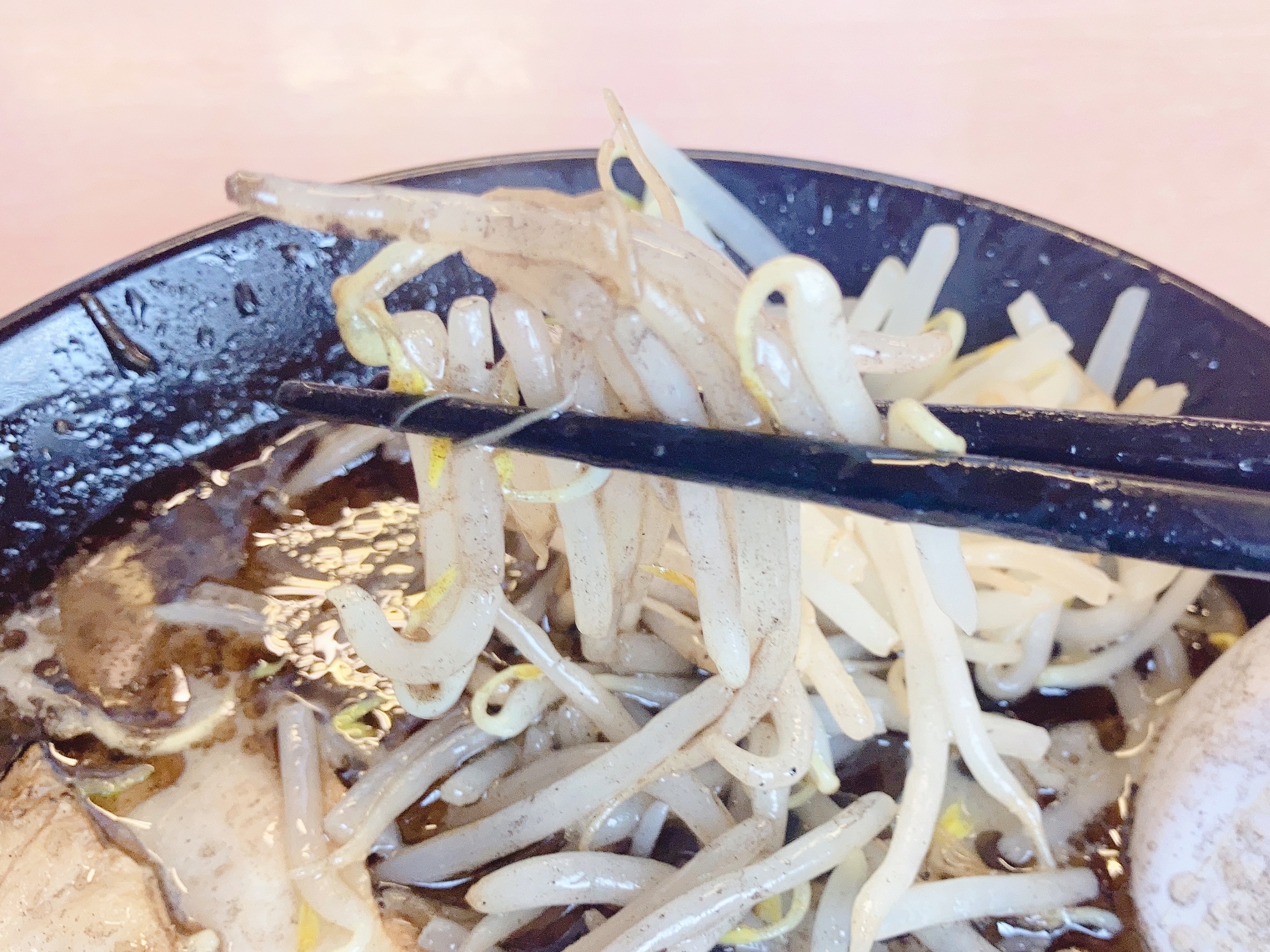 上にたっぷりもやしが乗っているので罪悪感ゼロ。スープにひたひたに浸して食べるのがおすすめ。