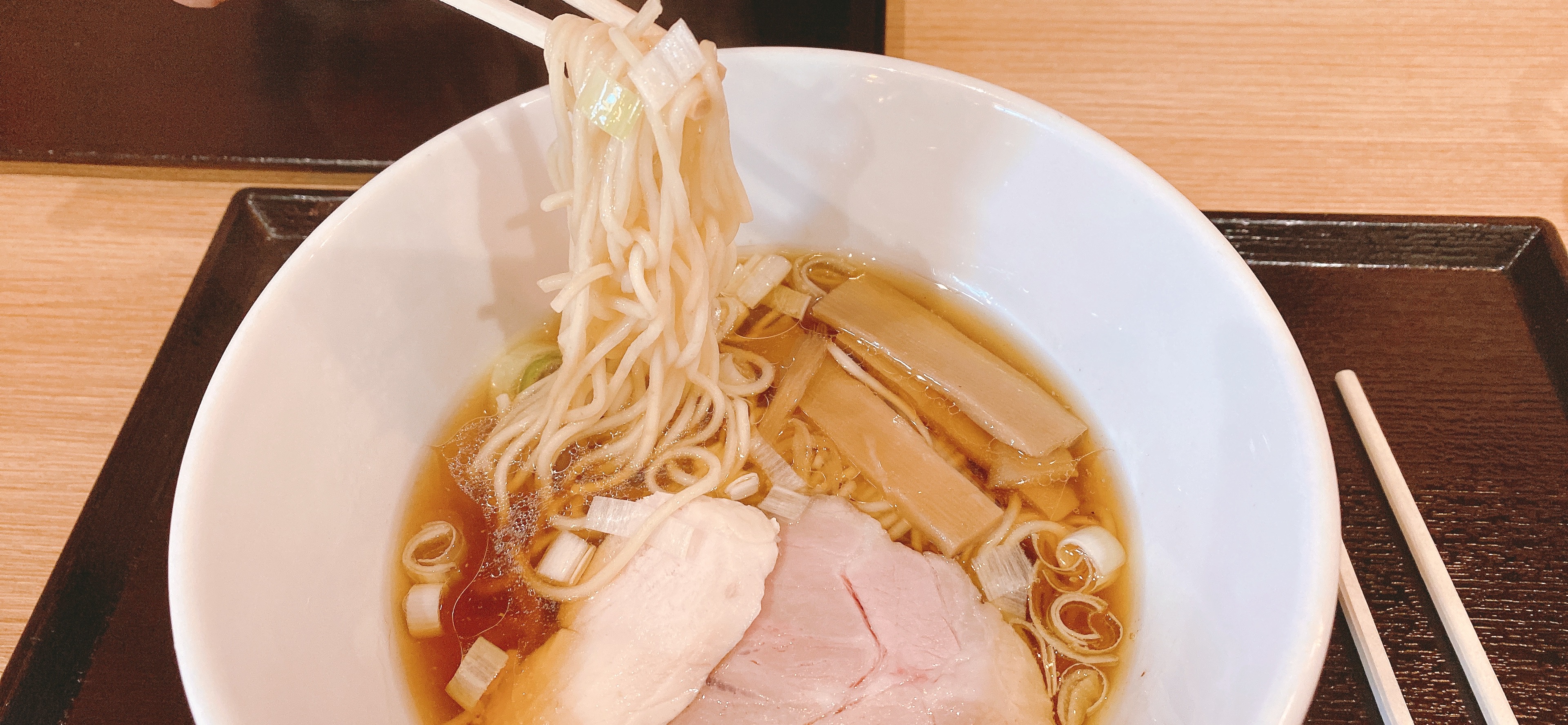 透き通るスープに綺麗なピンク色の豚と鶏の2種類のチャーシューがのっています。