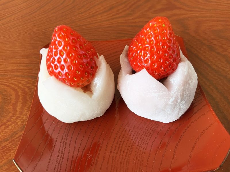 苺大福は2種類。まずはオーソドックスな「苺大福(右)」。たっぷりのつぶあんが詰まって、上に苺が乗っています。