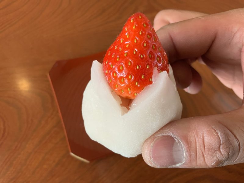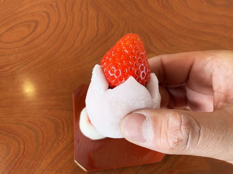 まずは「苺大福」。私の手が大きいので小ぶりに見えてしまいますが、いちごも大きめ。毎朝届く新鮮な熊本産のいちごを使っているそうです。