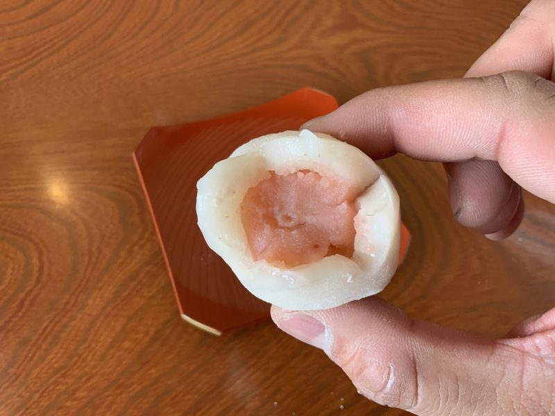 対して、左側の大福は「竹取物語かぐや姫」というお名前。白あんにいちご果汁を加えた自家製苺餡。
