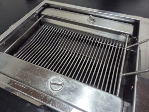 こちらは無煙ロースターと呼ばれ、網の部分が実はパイプになっており、ここに両サイドのタンクから水が流れる仕組み。これによりパイプの温度が極端に高温になりにくく、焦げ付きにくいのが特徴です。また、遠赤外線で肉を焼くことに加え、網の下にも水が溜められており、肉から落ちる油が水に落ちることで油のべたつきにくさ、煙の発生を防ぐといった利点があります。