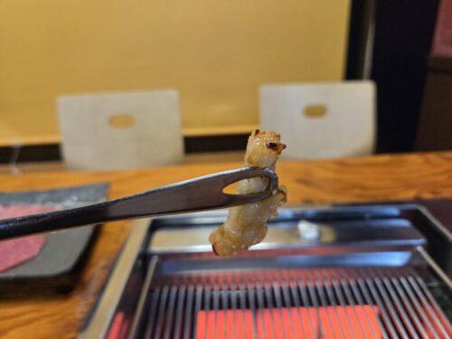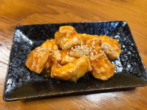 辛味ベースのタレに漬け込まれたシマチョウ。トロッとした甘みいっぱいの脂の後から程よい辛さが追撃。味噌のコク深いたれも相まって、ご飯が進む!