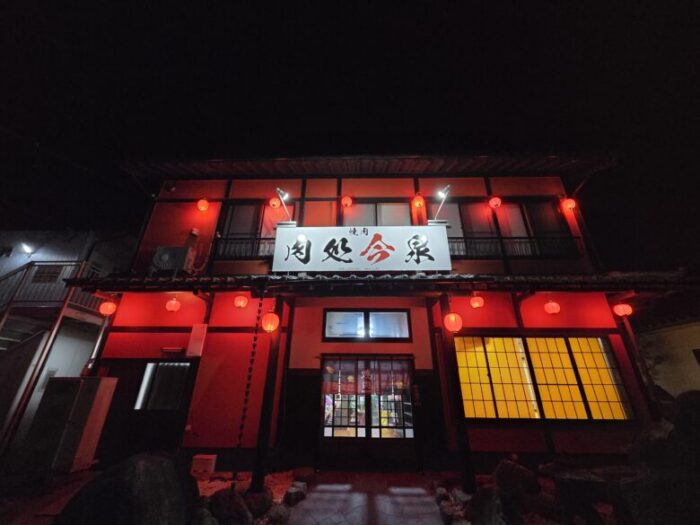 右側に赤い建物が見えてきます。こちらが「肉処 今泉」です。