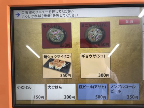 お店に入ってすぐ、食券機があります。メニューを見ると、チャンポンとギョウザと焼シュウマイがメインとなっています。