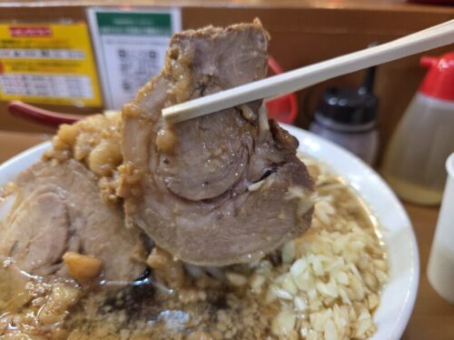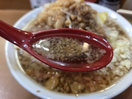 二郎系ラーメンのスープは油こってりで重たく感じるイメージがあったのですが、このスープは見た目に反して優しい口当たりで醤油のコク深い味わいです。とてもすすりやすい!