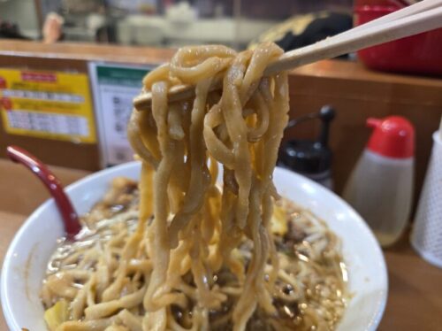 ある程度野菜を食べ進めると、ラスボスのような風格を纏ったちぢれ太麺の登場。