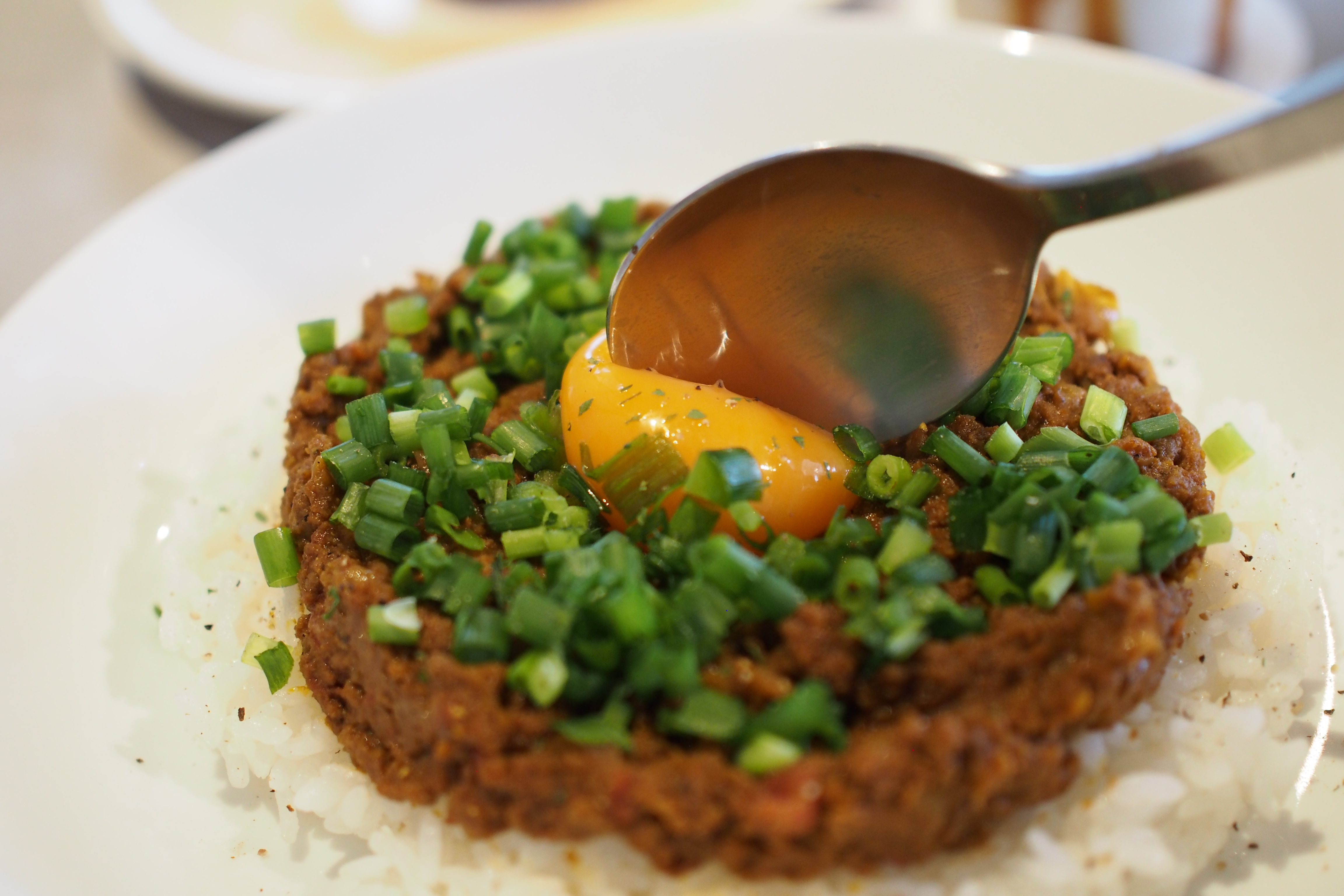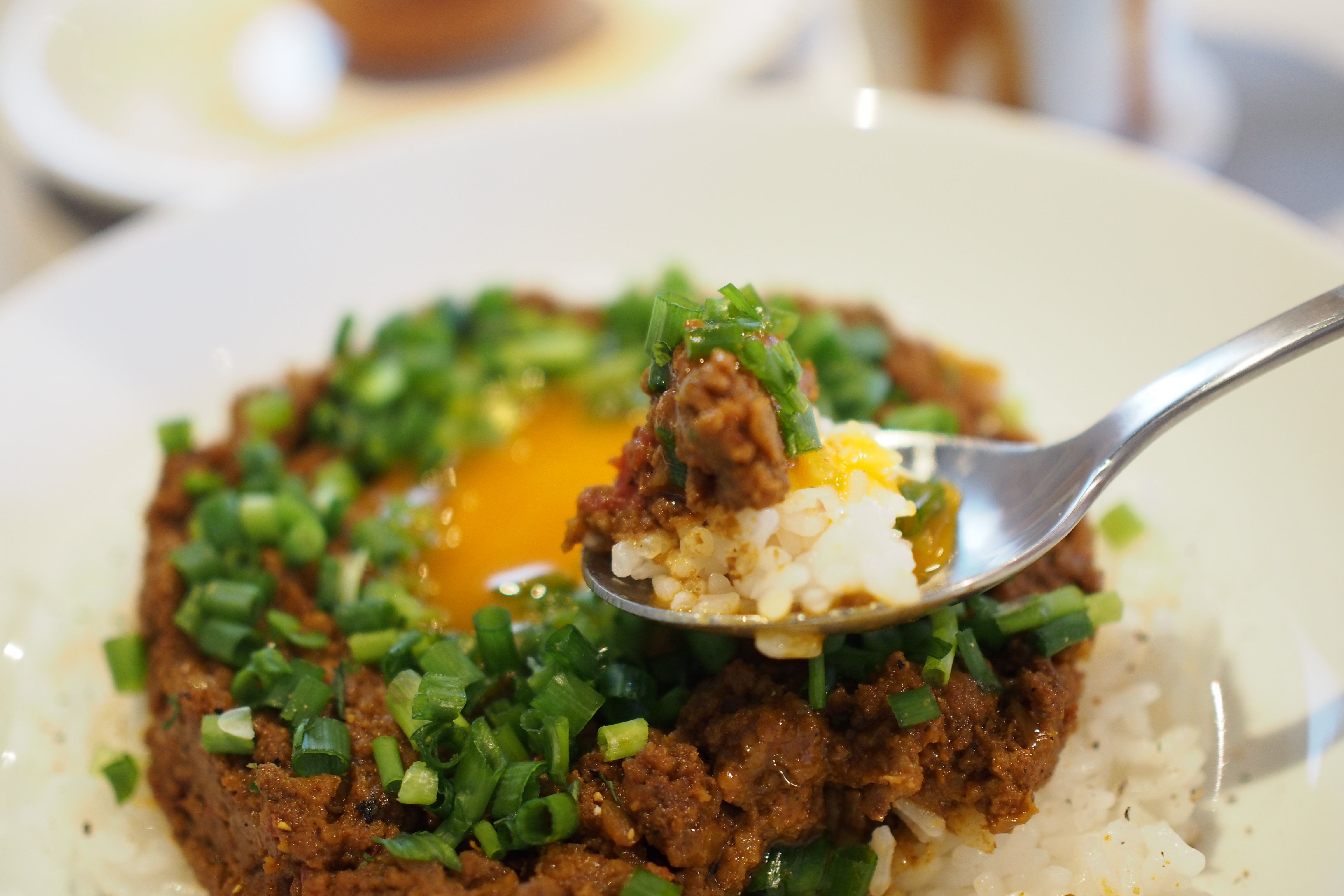 そして、中央にそっと優しく置かれた弾力のある黄身を、スプーンでプチュ~っと割るこの快感が楽しいキーマカレー¥750(税込)