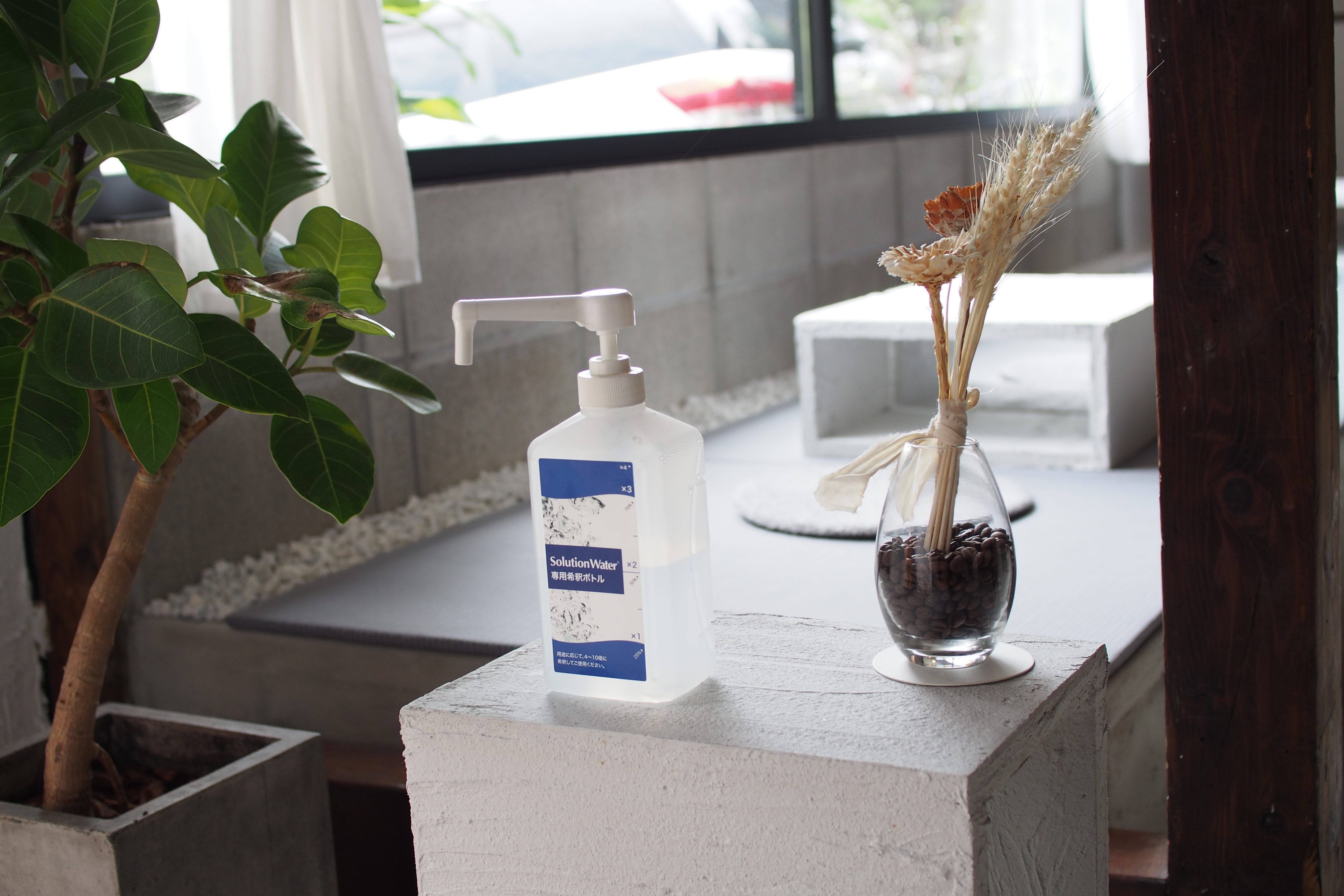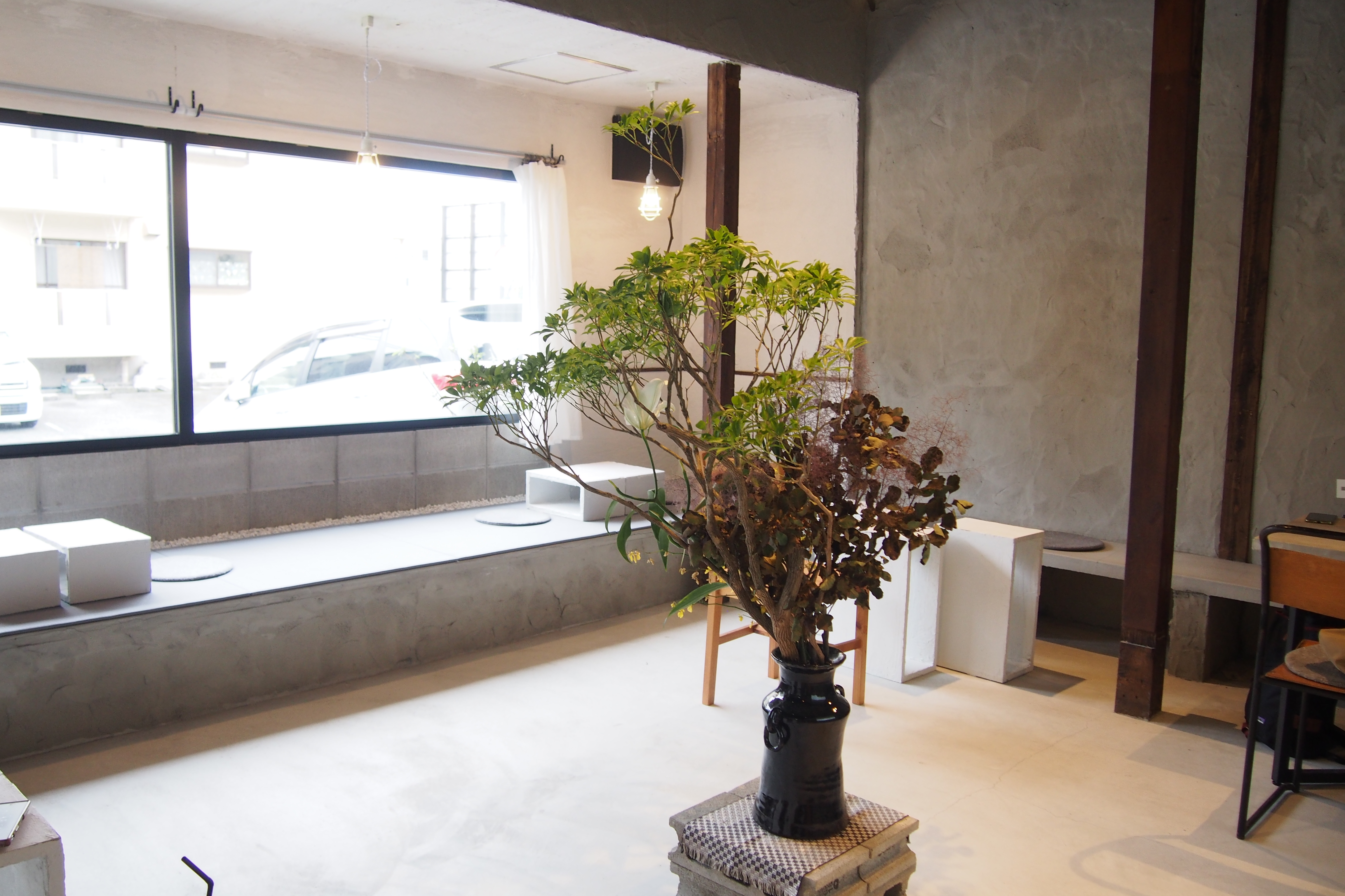 店内は”外構屋さんが仕上げる内装”をテーマに、壁はもちろんのことマンションの土台などで使用されるパーチクルボードという四角い箱型のものに漆喰を塗って水捌けの良いテーブルとして使用。住まいの参考になるオシャレなインテリアも魅力のひとつです。